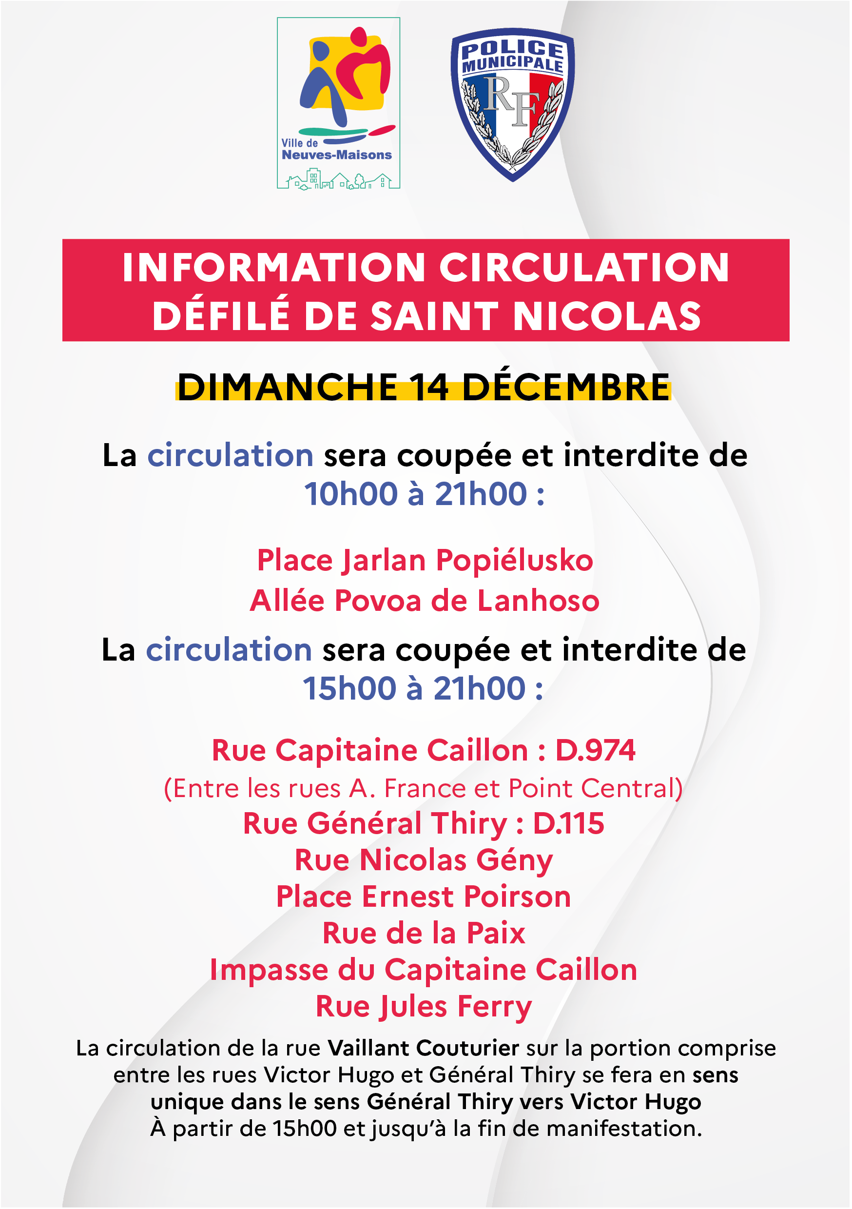 📌 Retrouvez ci-dessous toutes les informations de la police municipale concernant la circulation et le stationnement pour le dimanche 14 décembre