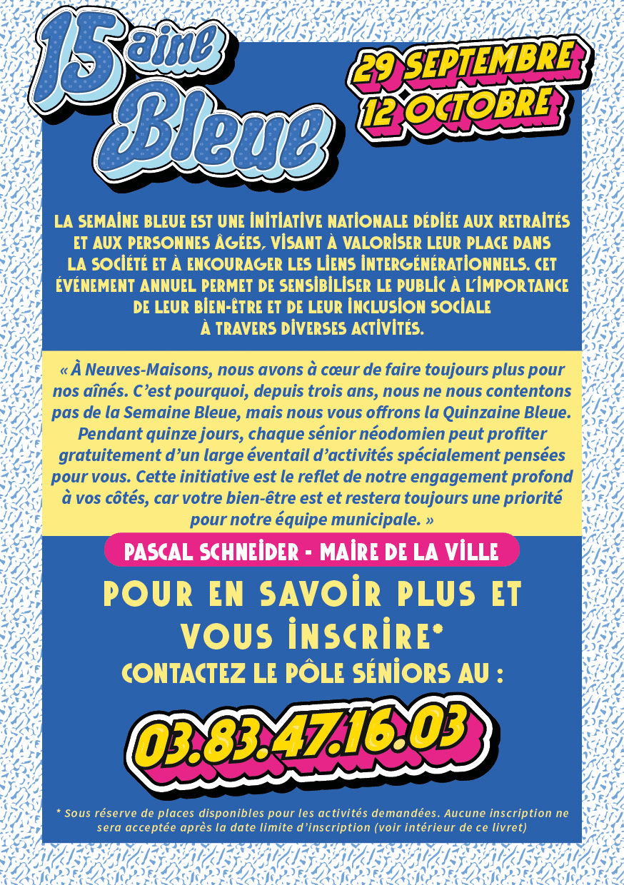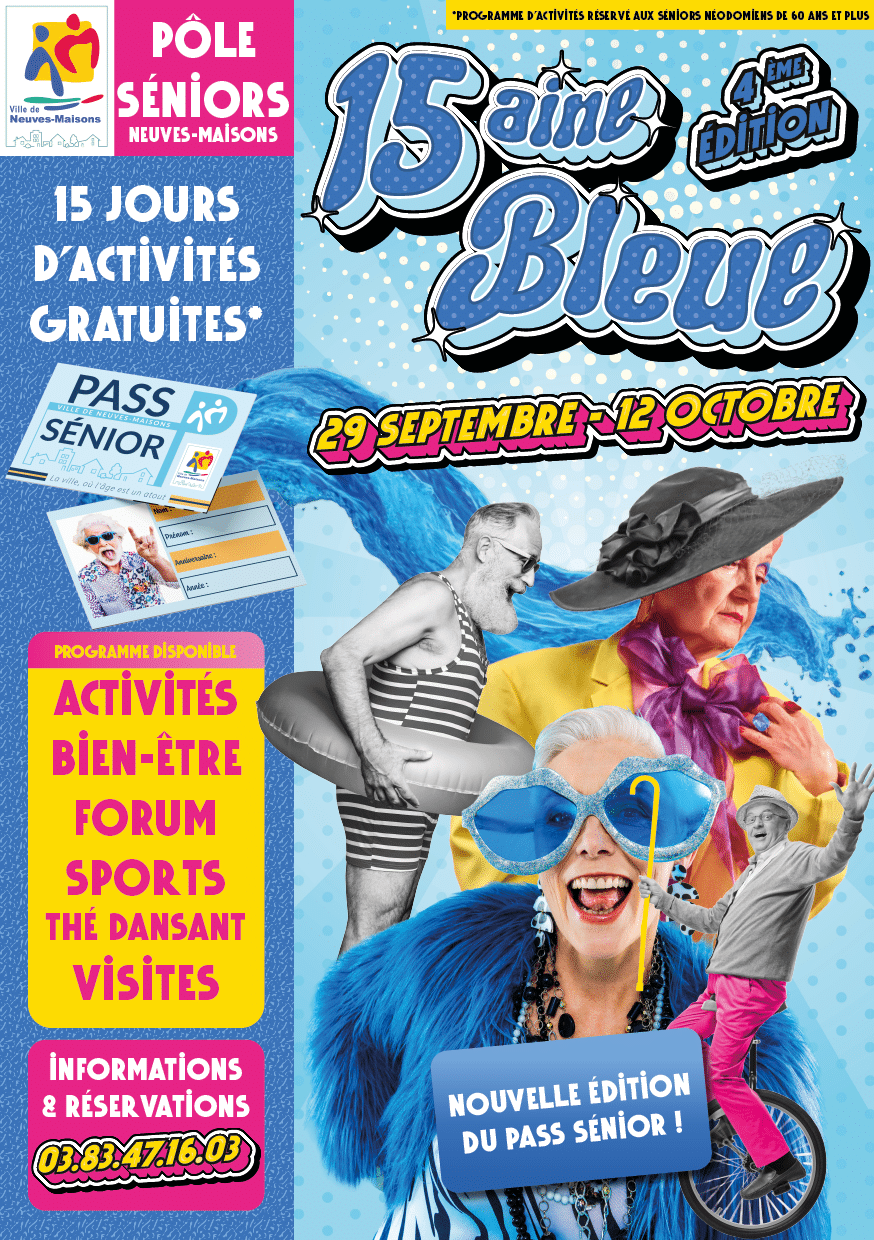 Du 29 septembre au 12 octobre, la Ville de Neuves-Maisons célèbre ses aînés en prolongeant la Semaine Bleue nationale avec deux semaines d’animations à destination des séniors néodomiens !